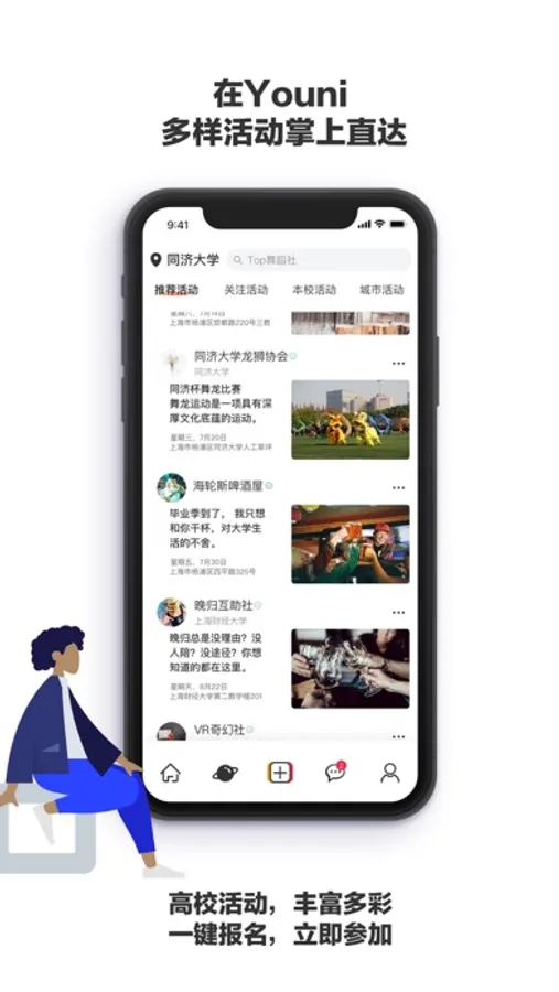 「一键参加活动」社团活动和企业活动实时推送,一键参加,精彩活动不容错过。