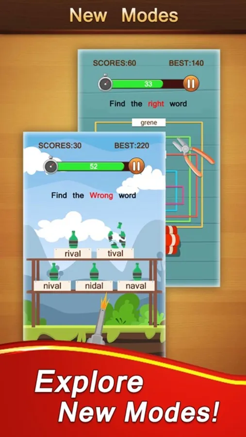 - Shoot word puzzle: find and shoot bottle with the wrong word.
