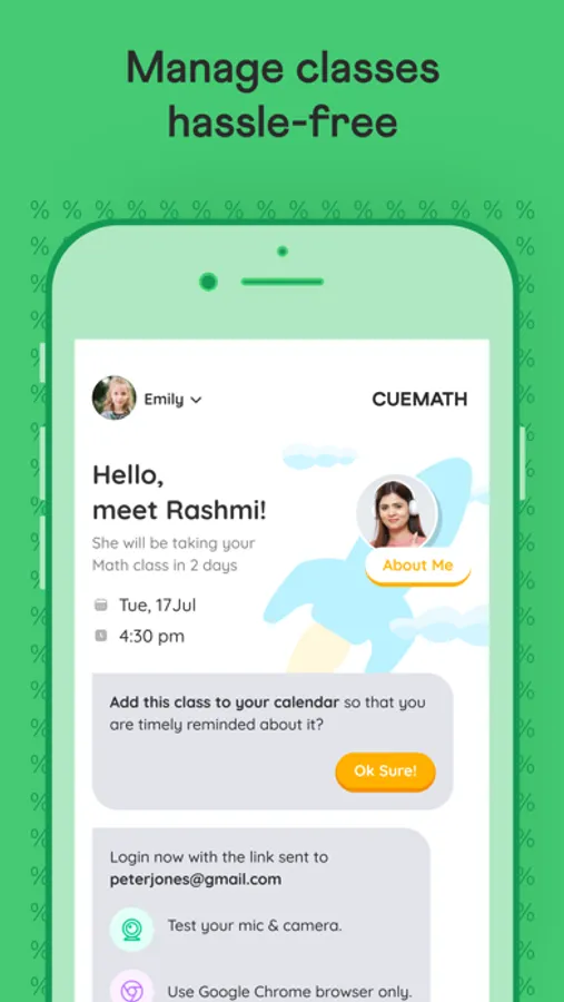 - You get a comprehensive look at the profile of the expert math tutor assigned to you while you book a free live online class through the Cuemath app.