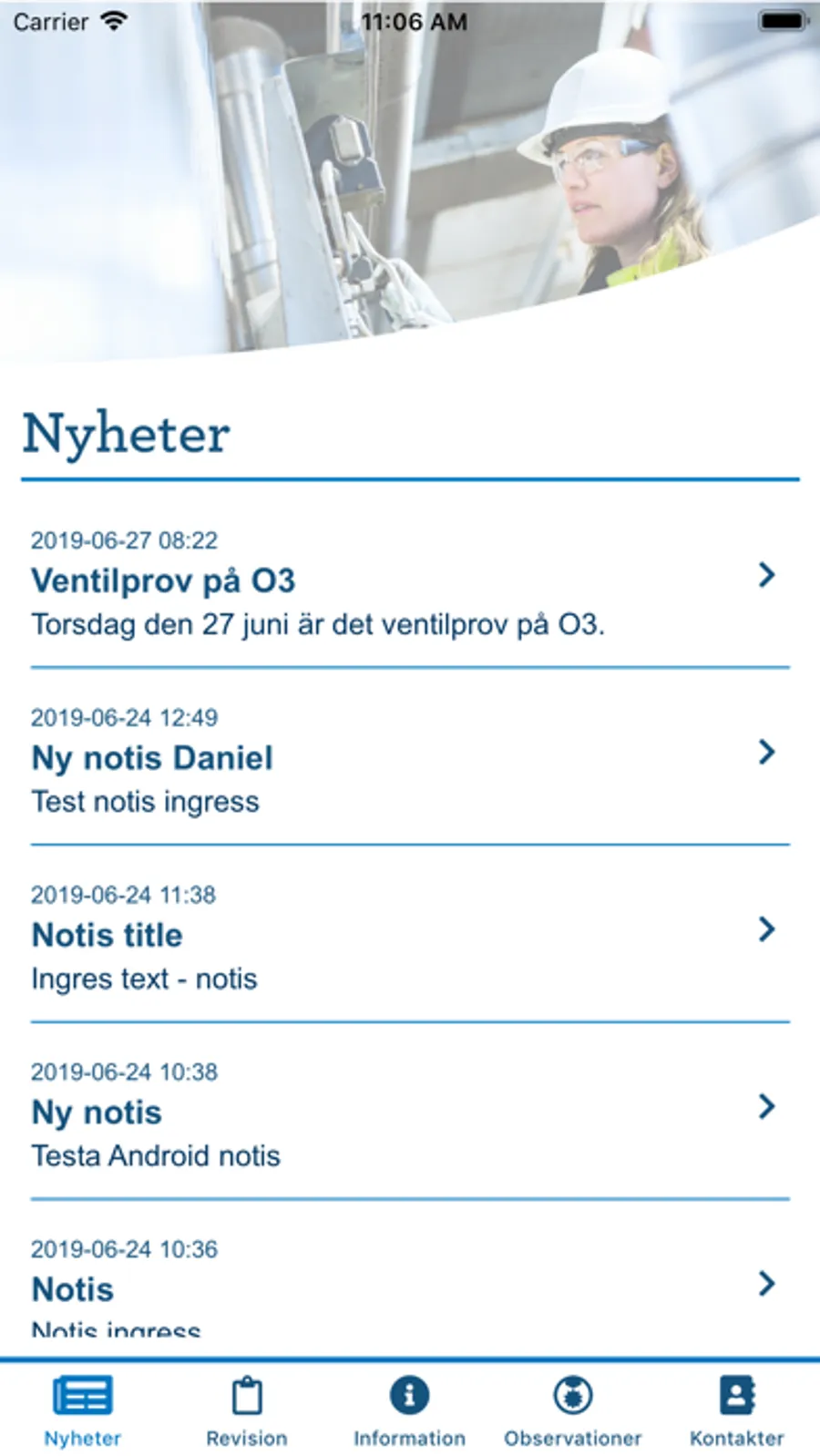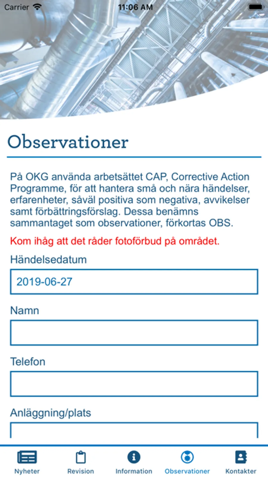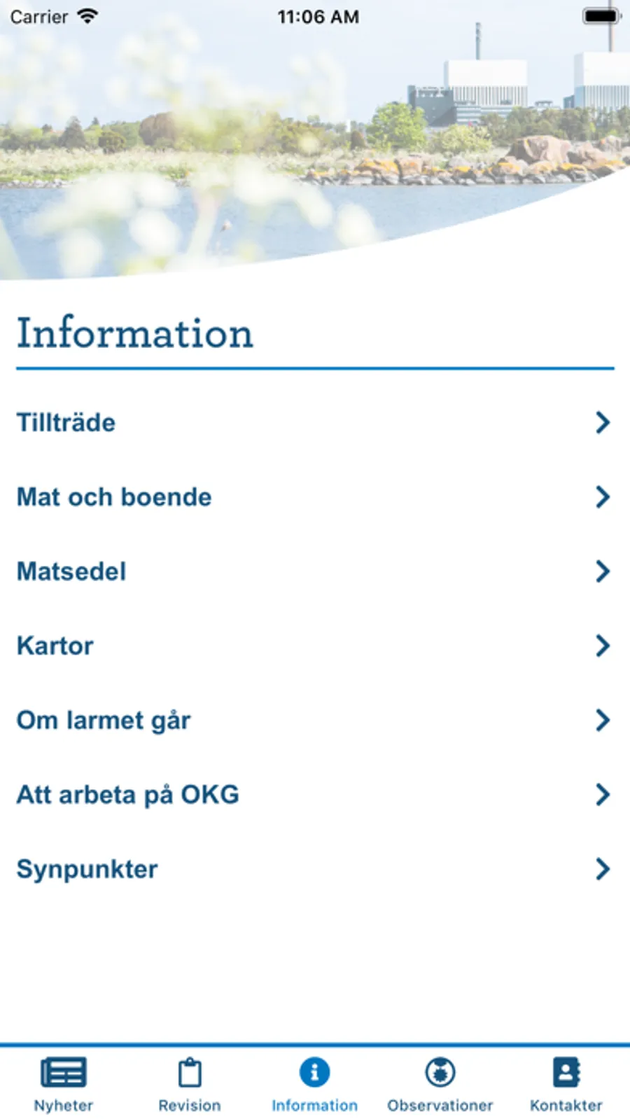 In OKG's new app, we have made it easier for you to find information before and during your work at OKG. In the app you will find news, telephone numbers, area map, and menu.