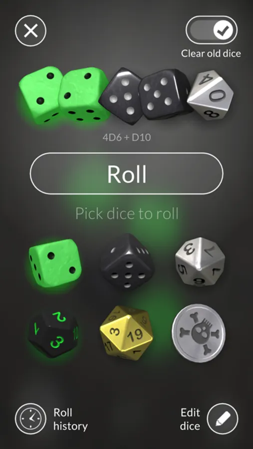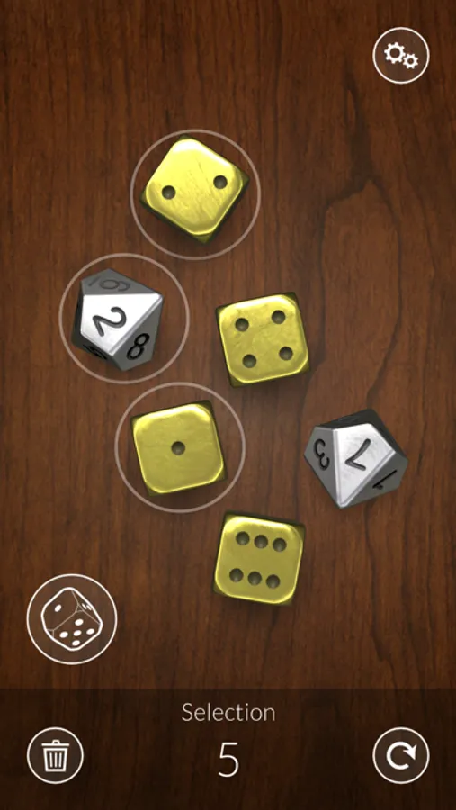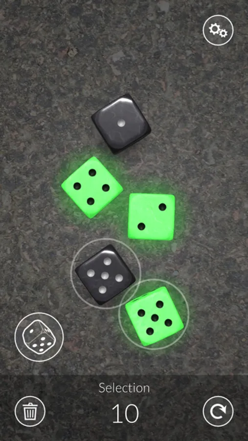 Set up your dice collection, choosing dice types, materials and backgrounds to fit your taste or the game you're playing. Then roll the dice in full 3d, move them around or tap to select and re-roll or remove individual dice. Easily roll combinations you've rolled before using the roll history list.