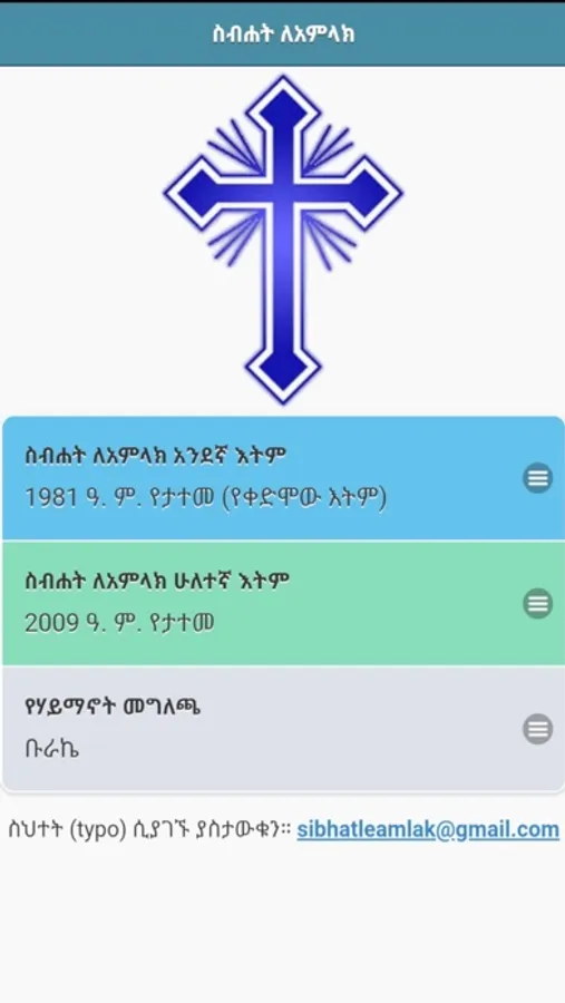 Sibhat LeAmlak app contains two editions of the hymn book by the same name. The first edition was published in 1981 E.C. and the latest edition was published in 2009 E.C.