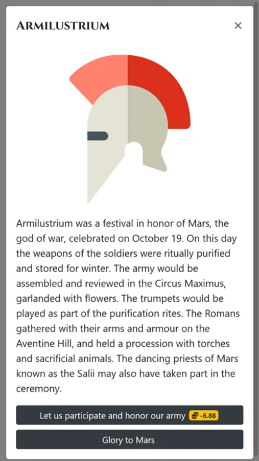 The game is open-ended without a set endgame just like in real life, but a grand goal for any ambitious Roman family was to land a Consulship of the republic. This could be your goal in the game as well, climbing the Cursus Honorum and becoming a "New Man" - "Novus Homo"