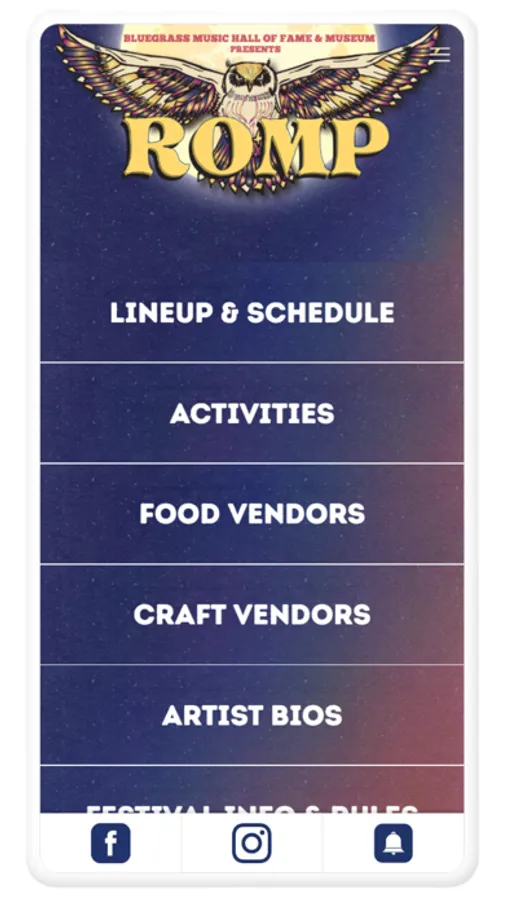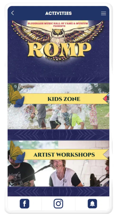 The ROMP Fest app is designed for all festival-goers to maximize the ROMP experience. From stage schedules, vendor listings with menus, workshop and kids zone schedules, the rompfest app provides up-to-date info on the happenings during ROMP.
