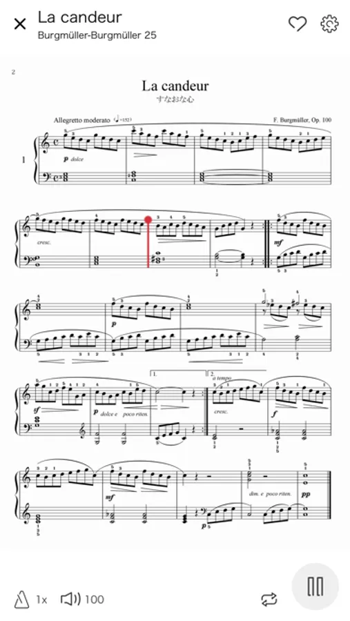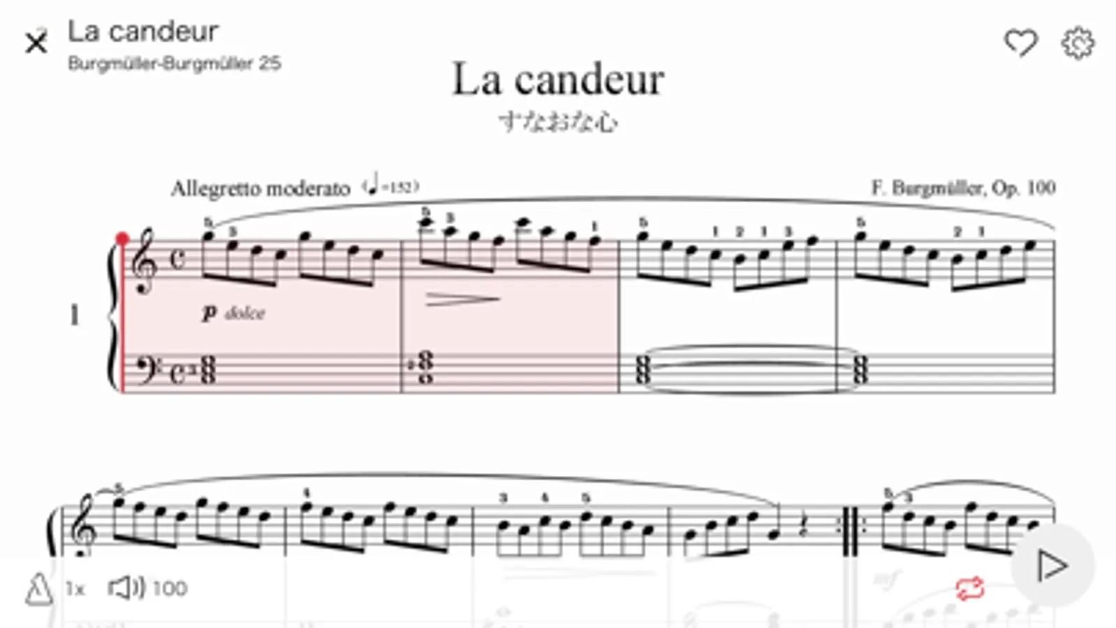 Tap a bar on the score to specify the play position or playing range. Once the start and stop points are set, the passage will repeat continuously until stopped.
