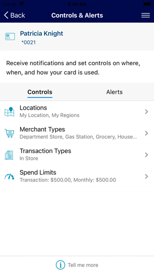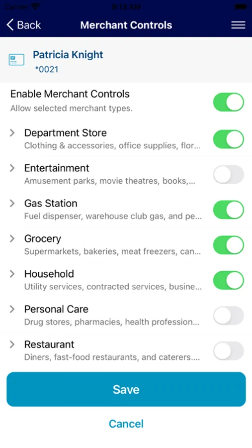 Set spending limits to decline transactions above your thresholds. Monitor activity by category such as gas stations and restaurants, and by type: in-store purchases, e-commerce transactions and ATM transactions.