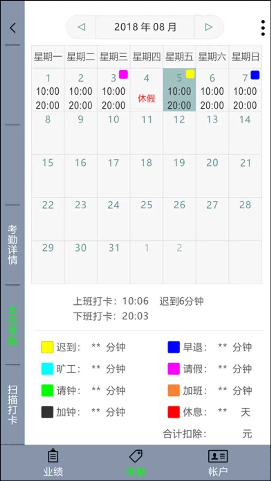 本系统是手机APP应用系统,专注适用于美业行业,例如:美容,美发,美甲,彩妆,保健,足浴,推拿,按摩,养发等行业;员工注册登录系统,可以查询个人业绩,包括每天业绩、每月业绩、每年业绩。手机扫描打考勤,考勤统计、员工作品上传和展示等功能