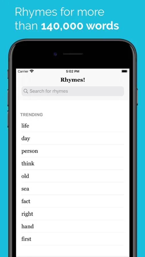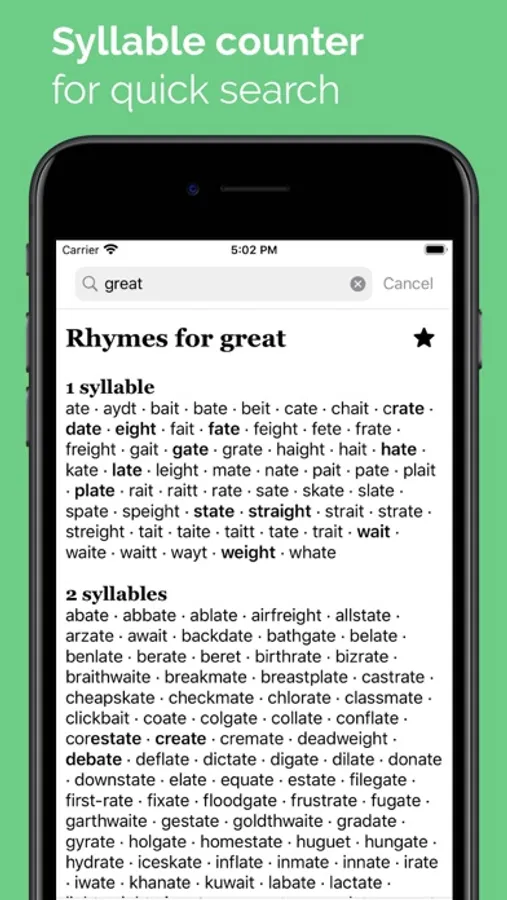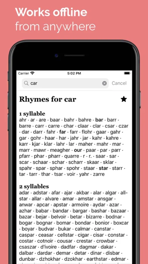 The application has over 140,000 word entries that works offline anywhere and anytime. It provides a comprehensive rhymes output divided by syllable count. Also, there's possibility to save needed words in "Favorites" in order to use it later.