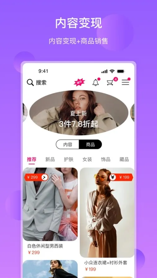 -零售、拼单、微商多场景购物,购物和内容可无缝切换。