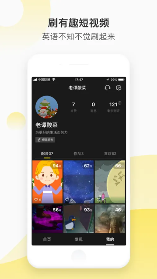 为海量英语短视频配音,语言简短,轻松模仿。每日花10分钟学习,轻松累积常用英语词汇单词;
