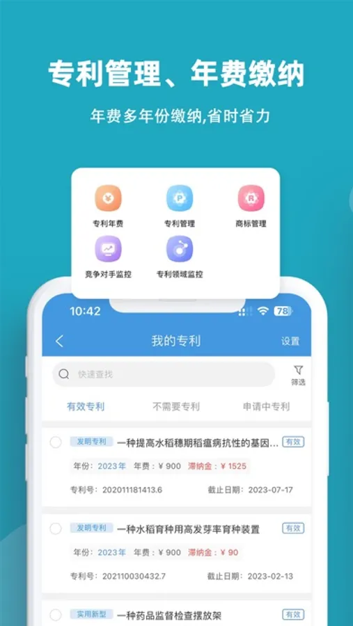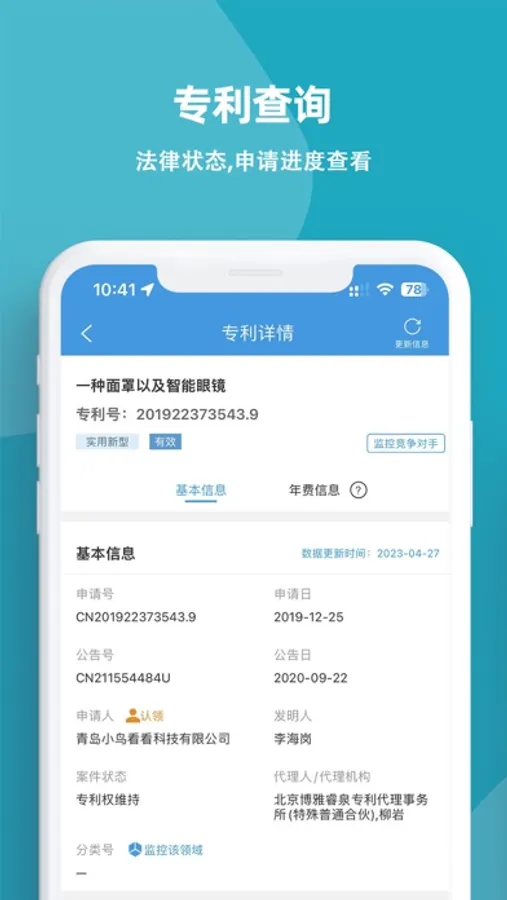 专利监控管理: 实时监控专利法律状态、年费信息、申请进度、一键认领企业能够全方位管理旗下专利上述信息。另外可以监控具体技术领域最新授权专利、竞争对手专利概况及动态。