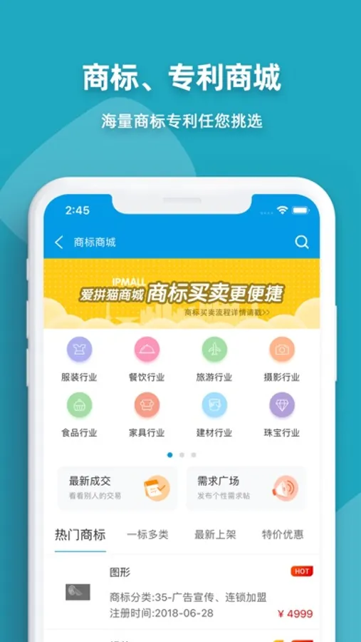 知识产权商城:主要提供商标买卖、专利交易、商标交易、授权许可、品牌加盟、技术转让等在线商城服务。