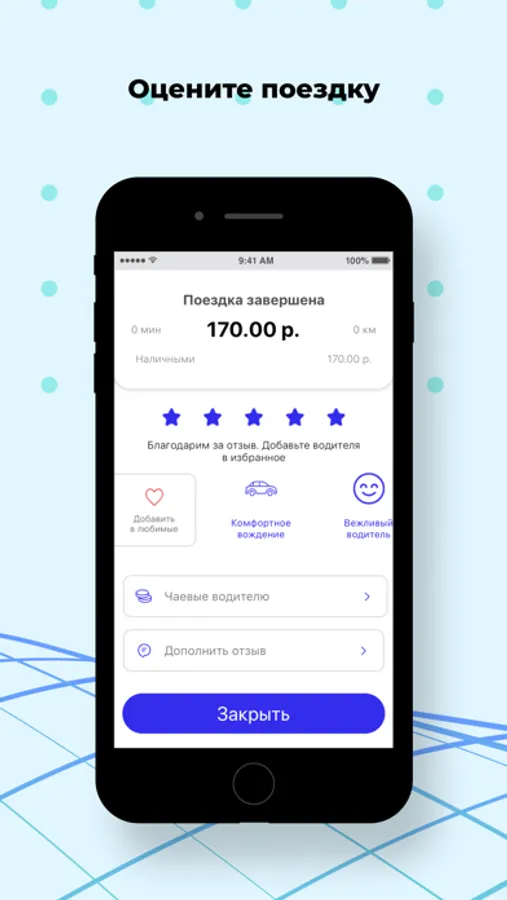 Следите за поездкой на карте. Приложение сообщит время подачи, марку, цвет, номер машины, а также имя водителя.