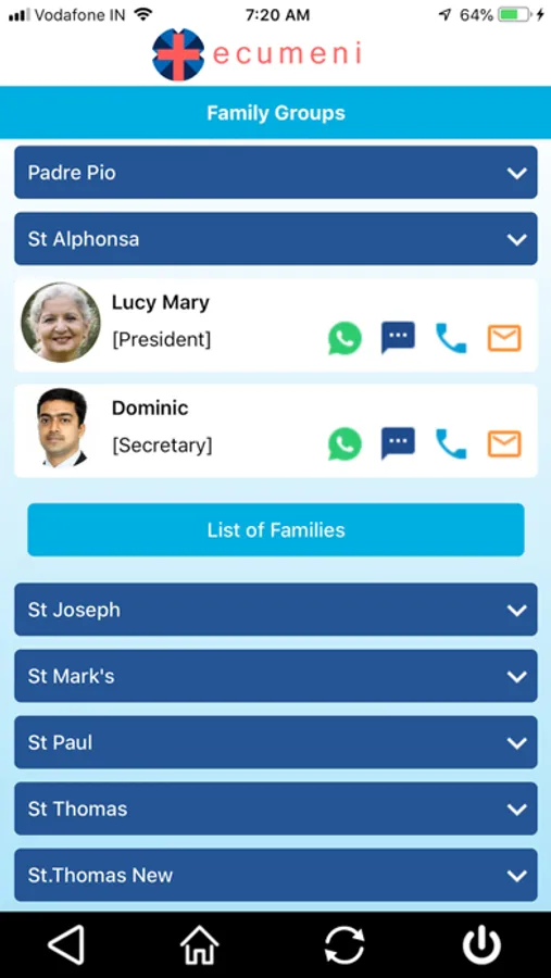 Family List: List of all Families, grouped into Family Units/Ward for Church Pastor with direct Call, SMS, Email.