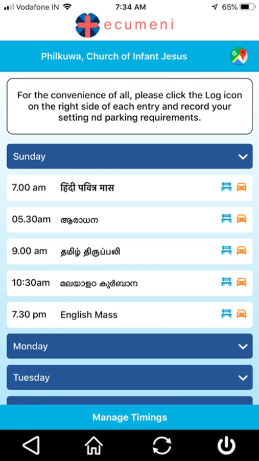 ChurchTimings: This is available to Pastors and Members. Mass timings and other liturgical events of all week days. The intent is to make this information available to members instantly, including that may have changed after the previous Sunday announcements