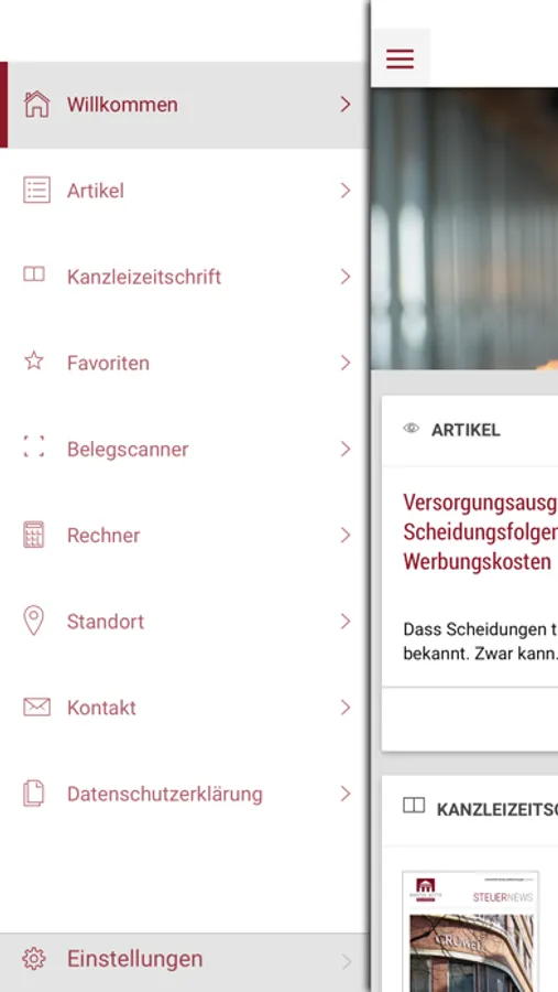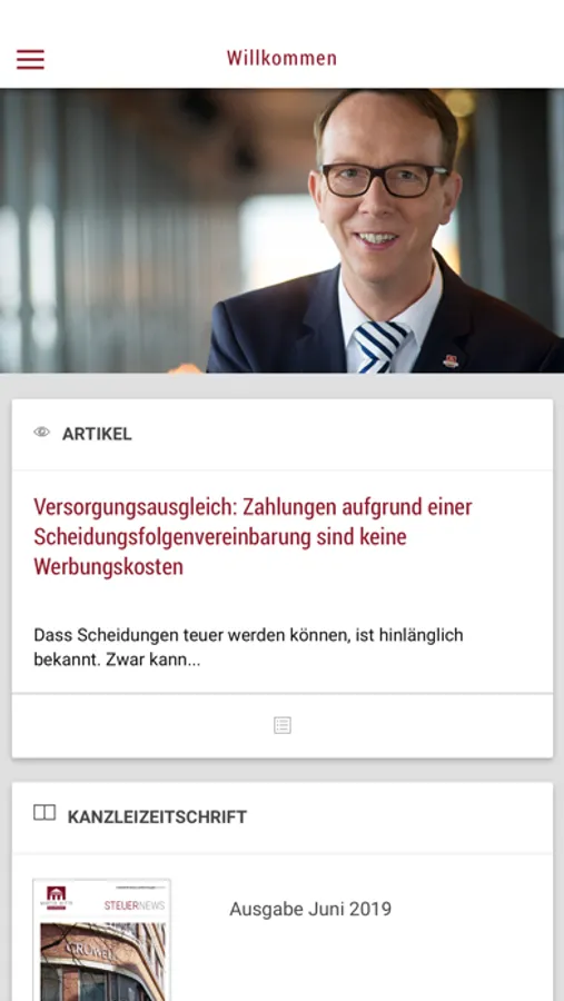 Unsere kostenfreie App ist eine einfache mobile Lösung für aktuelle Informationen aus den Bereichen Steuern, Recht und Wirtschaft. Hilfreiche Funktionen wie Brutto-Netto-Rechner, Annuitätenrechner und Belegscanner sind genauso enthalten, wie die Ausgaben unserer monatlichen Kanzlei-Zeitschrift STEUERNEWS.