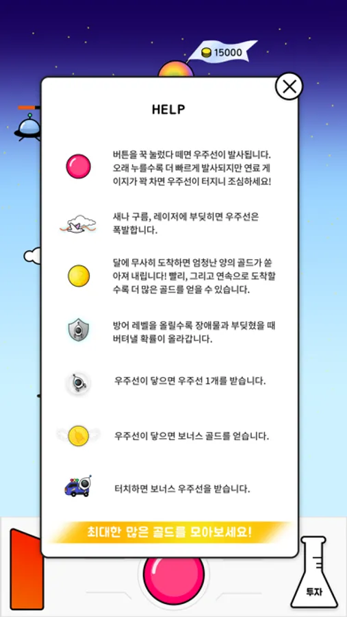 도전! 골든달은 우주선을 달로 쏘아보내 금은보화를 모으는 게임입니다. 지하철에 서서 갈 때, 공부하기 싫을 때, 멍 때릴 때 원 버튼으로 편하게 즐기세요.