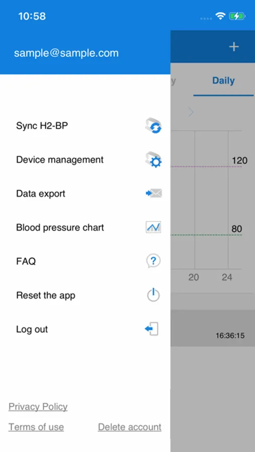 The H2-BP app is an app that helps to manage health by storing blood pressure data measured with the wrist band blood pressure monitor and displaying it in a graph.