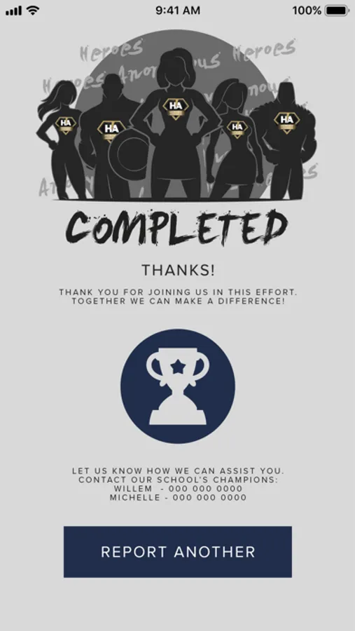 The Heroes Anonymous App is a reporting tool that makes it easy for students to report any form of Bullying, Teacher Student Conflicts, Violence, Drugs and Weapons. The Heroes Anonymous App provides crucial information to the school of what happened, who was involved and when and where it happened. The app also makes provision to log incidents for students who are feeling sad and want to harm themselves or who have harmed themselves already. Students can also nominate a school champion who has done good to fellow students.