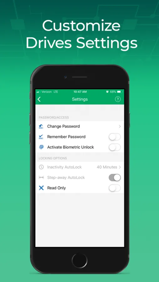 SecureData Lock BT technology ( by ClevX) allows you to access and control your SecureDrive® BT or SecureUSB® BT from your iOS devices. Authenticate with PIN, FaceID, or TouchID for an added layer of security for your information.