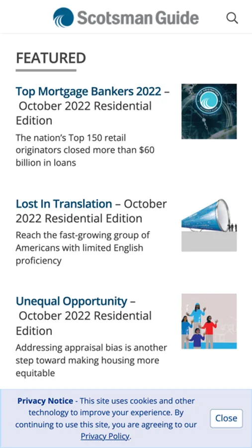 Scotsman Guide’s residential edition has been the premier magazine for residential mortgage originators for more than 25 years. Each monthly issue explores trends and news topics that impact the residential mortgage industry and connects originators with lenders to fund a broad range of conventional and niche mortgage products. Get this app for in-depth content written by industry leaders and Scotsman Guide’s award-winning journalists, lender directories, branch opportunities, industry events, the industry’s only verified rankings and more.