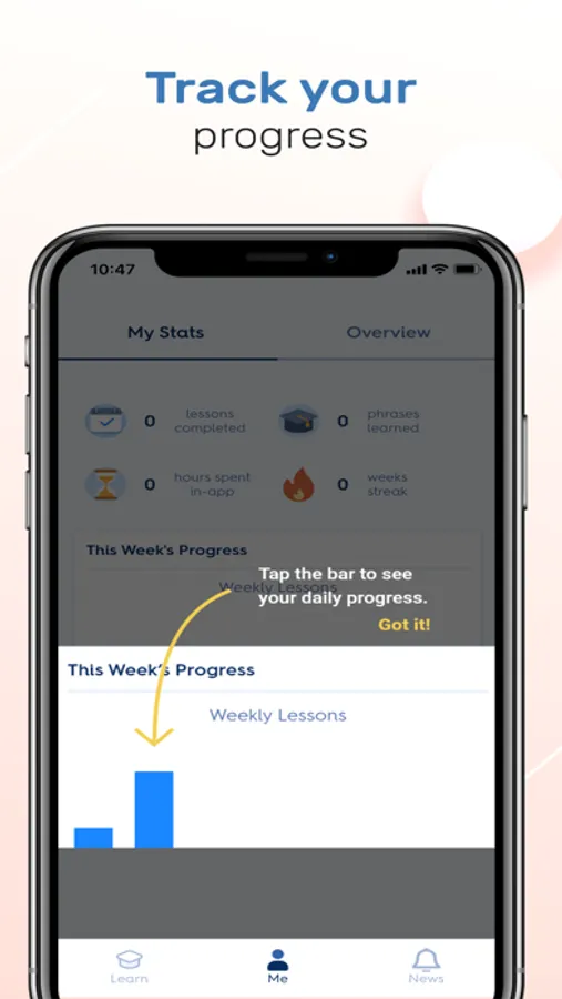 • 100 easy and useful lessons to choose from. Start from a simple “Hola” or “Ciao” and track your progress to full-on conversational sentences.
