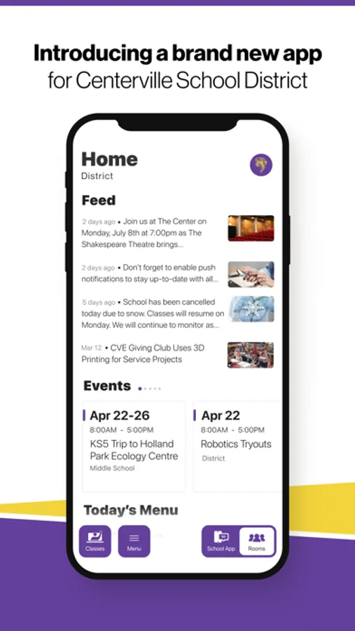 The event section shows a list of events throughout the district. Users can add an event to their calendar to share the event with friends and family with one tap.