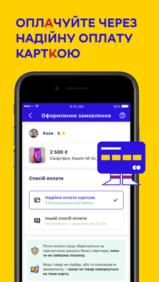 - безпечно оплатити карткою на сайті: продавець отримає гроші тільки після того, як ви заберете товар. А якщо товар не відправлять — вам на картку повернеться вся сума;