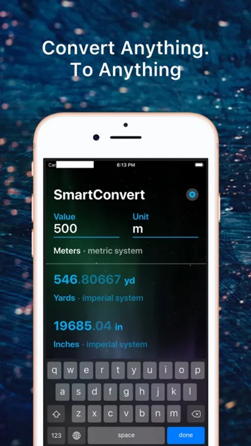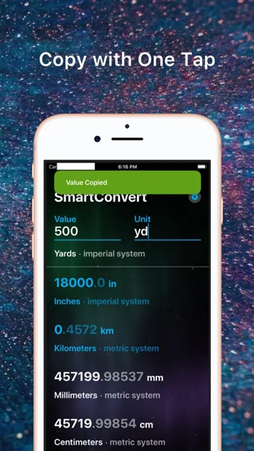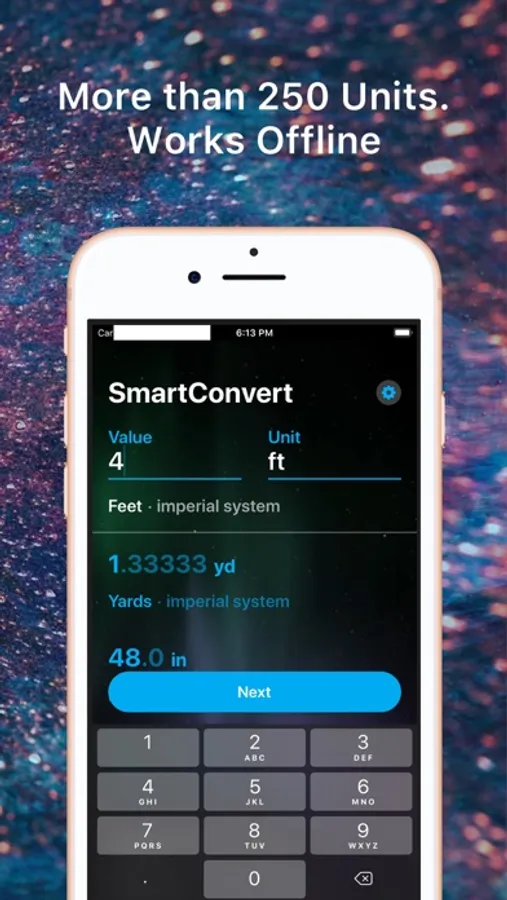 You don't have to specify which output units you want to see – we show you all the units available, sorted automatically by relevance. Want to convert metric to imperial? We'll show the same value converted in inches, feet and yards – all in the same screen. SmartConvert includes than 250 units and works offline!