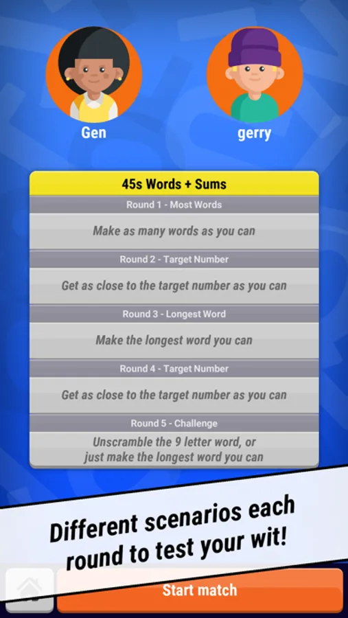 Words and Sums is the next evolution of word and number games! Play for free with family, friends or against "the CPU" as you unscramble the letters and numbers while improving your vocabulary and math skills.