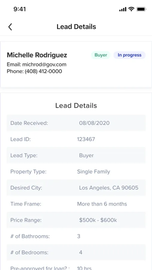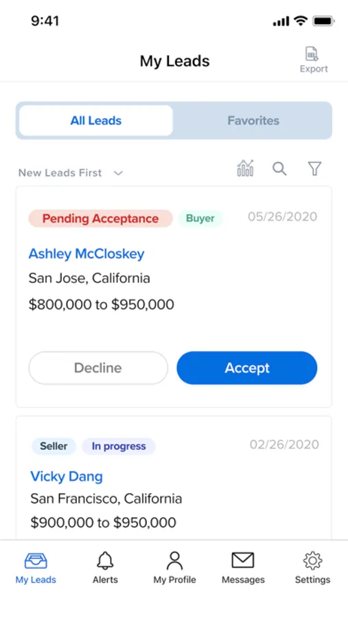 Efficiently track your leads and manage the status of the process each step of the way. Filter and search for leads by name, address, or listing value. Contact the client by calling them or messaging them directly from the app. Add leads to Favorites for faster accessibility.