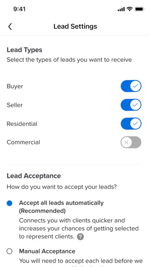 Decide whether you want notifications via email, text, app, or all of the above. Manage your account type, email, password, and even pause leads if you are on vacation.