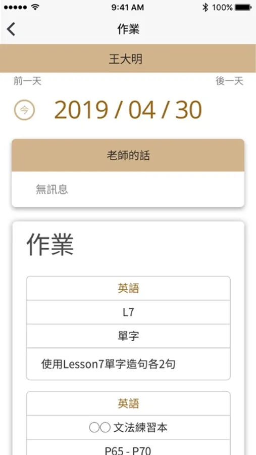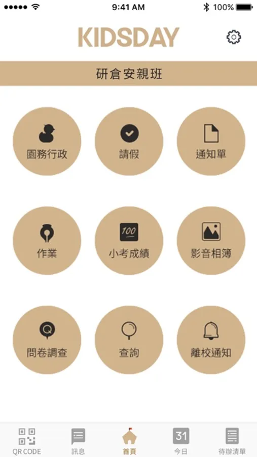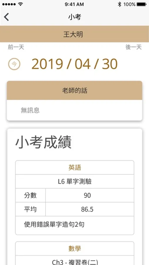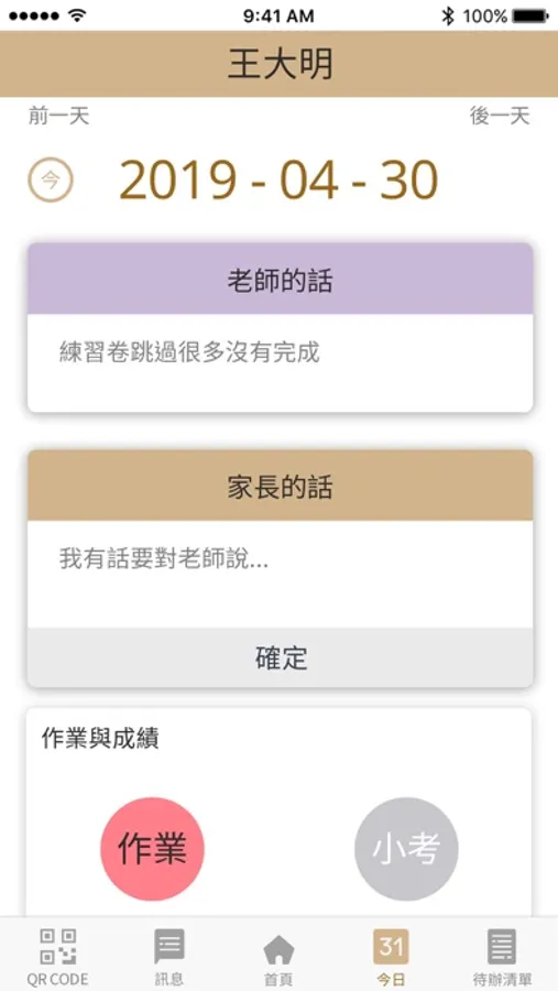 KIDSDAY CLASS家長版雙向溝通電子聯絡簿,特別設置了作業及小考成績的結果,以及明日攜帶物品提醒的單元。