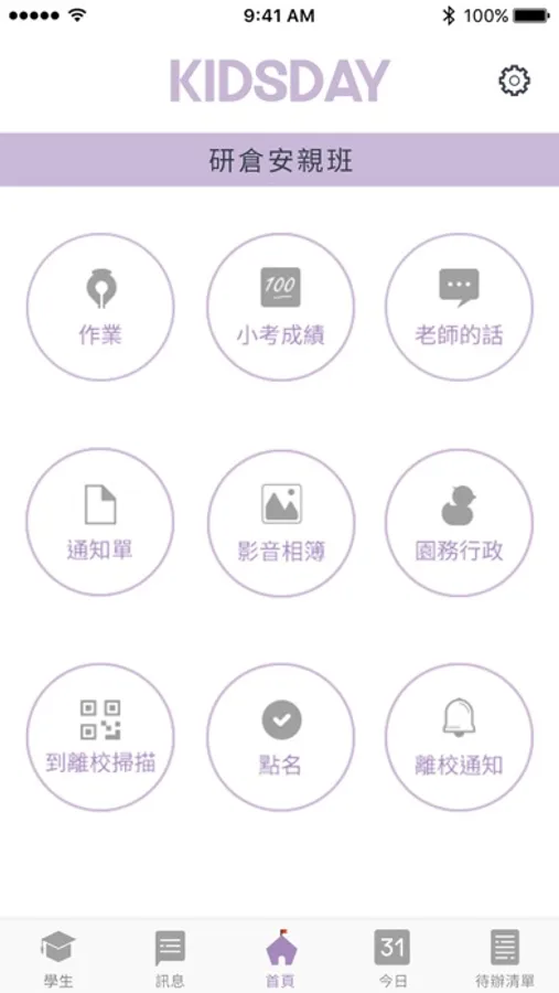 KIDSDAY CLASS雙向溝通電子聯絡簿,特別設置了作業、評量完成與否的提醒,及小考成績的登錄,以及明日攜帶物品提醒的單元。
