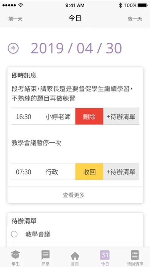 8. 訊息:提供校方發送即時訊息通知學生家長。