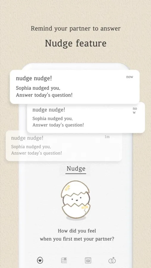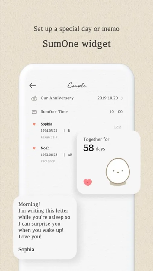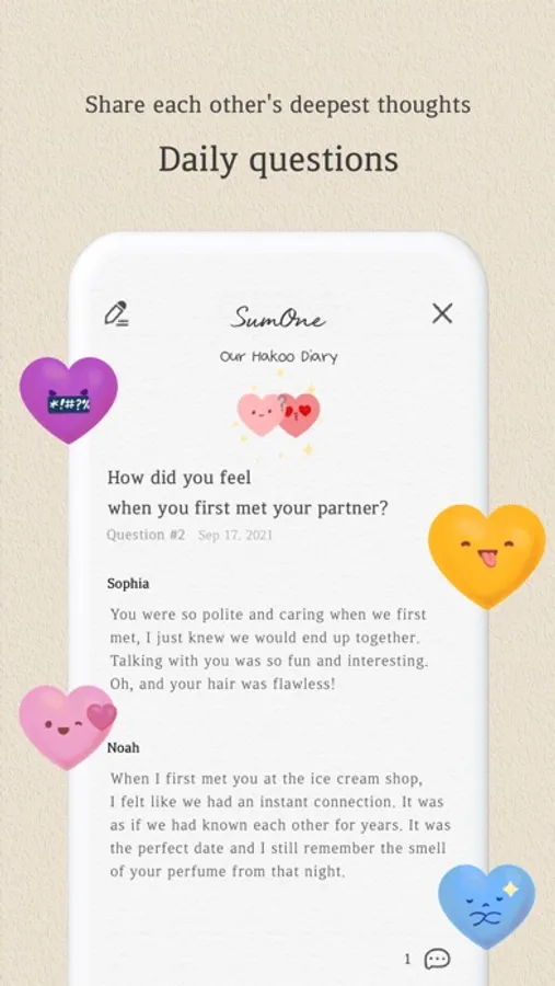 Every day at a time of your choice, SumOne gives you and your partner a question - ranging from deep and introspective to cute and surprising! It’s a chance for you to share more about who you truly are, learn about your partner’s heart and soul, and strengthen your bond!