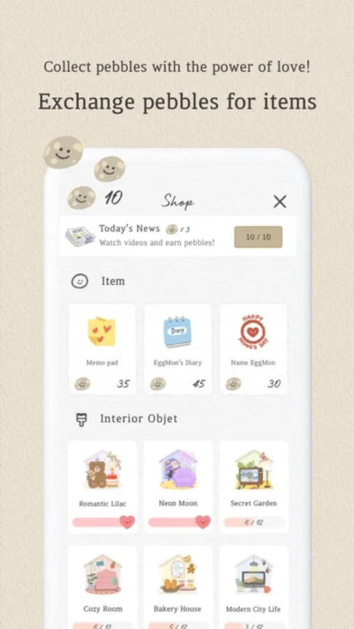 With the pebbles (in-app currency) you collect together within the app, you can buy various items to decorate little EggMon’s room!