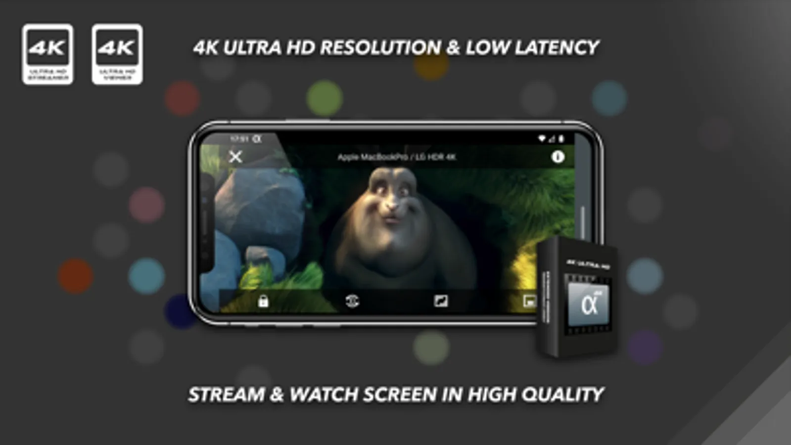 Experience brilliant 4K Ultra HD video quality in an extended version of alfacast. Share and split your live video screen stream to many devices simultaneously. App allows you to broadcast and to watch any content from desktop. Stay secure with alfacast while watching live streaming, the app supports end-to-end encryption technology. Automatic discovery technology will allow you to enjoy using the app. Forget about logins, installation and the long process of setup video broadcast servers, for alfacast it is simply not necessary. Stream your content from a video camera apps, photo album apps, stream video from player apps, show presentations, slides, photos or pictures anywhere and anytime!