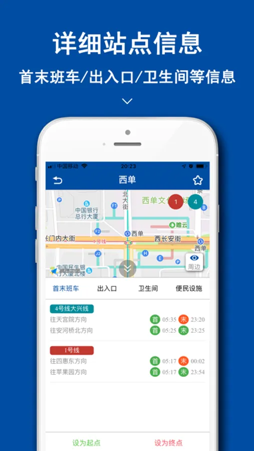 详细站点信息:站点首末班车时间,车站服务设施(卫生间和电梯等)、出入口信息等。