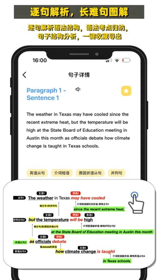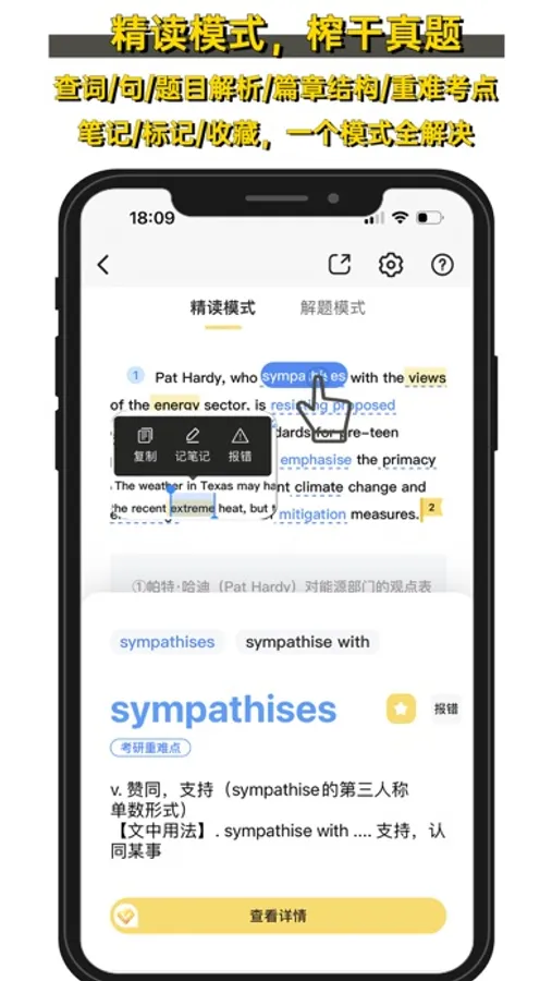 精读模式,查词/句/题目解析/篇章结构/重难考点;笔记/标记/收藏,一个模式全解决