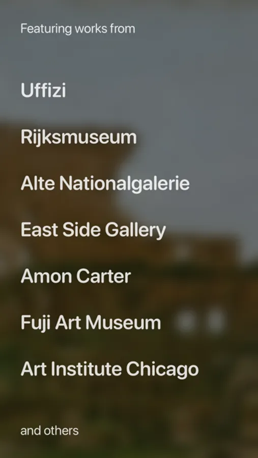 All wallpapers available in the app are the works from some top-tier galleries and museums all over the world. Featuring Rijksmuseum Amsterdam, Fuji Tokyo, Uffizi, Art Institute Chicago, East Side Gallery Berlin, Fide, Amon Carter Museum, Alte Nationalgalerie Berlin, and many more.