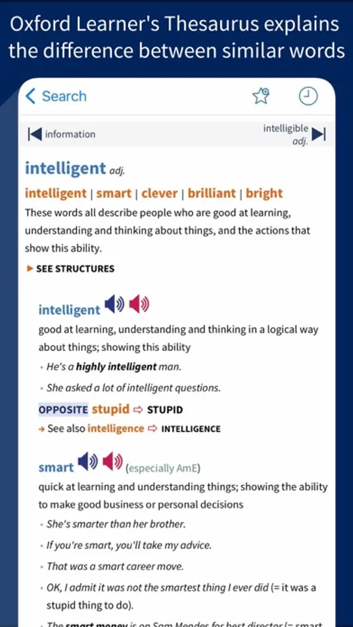 The Oxford Learner’s Thesaurus is a dictionary of synonyms that helps you to understand the differences between similar words, and to find the right words to say exactly what you mean. For example, is there a better word than ‘nice’? What is the difference between ‘easy’ and ‘simple’? What is a more formal synonym of ‘choice’?