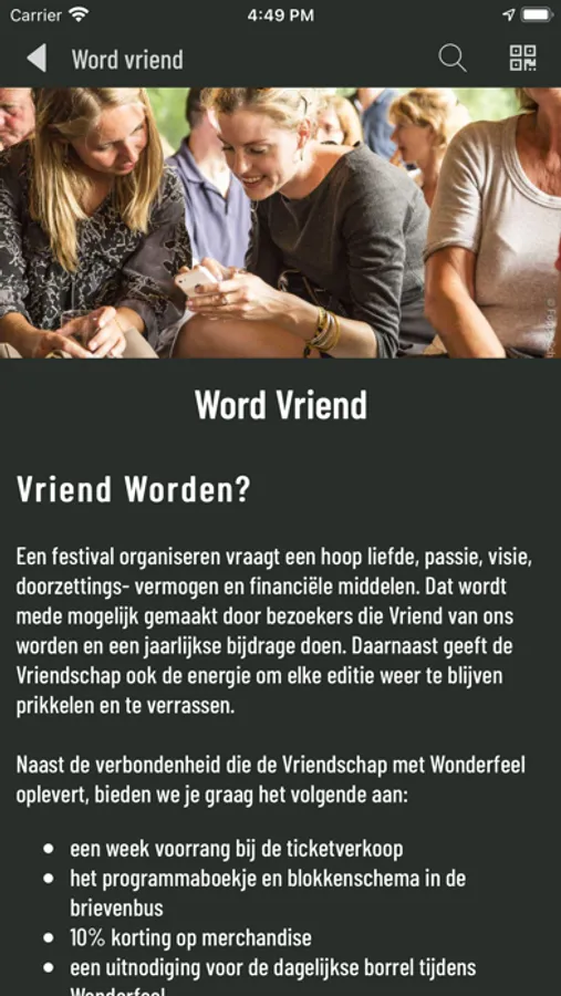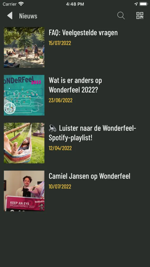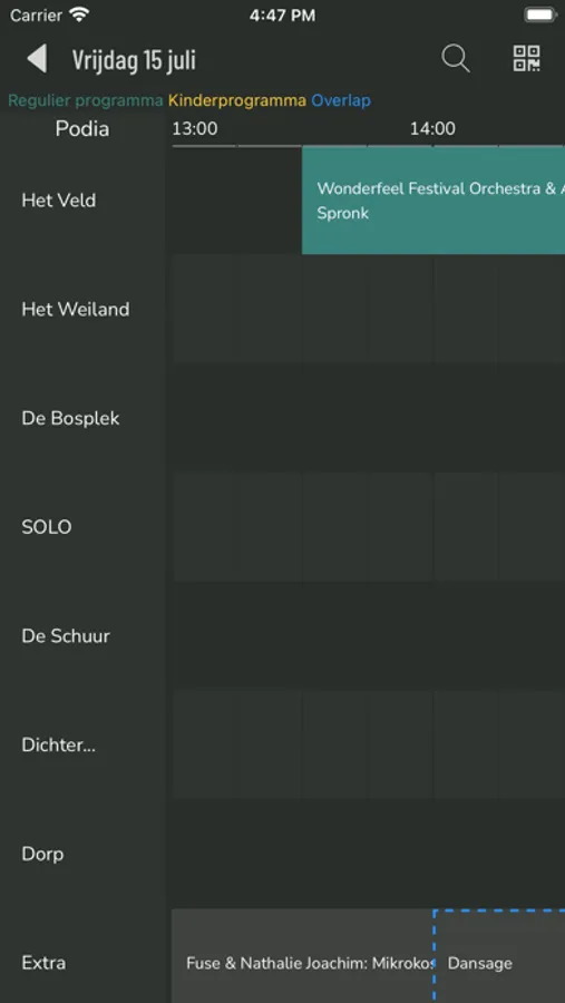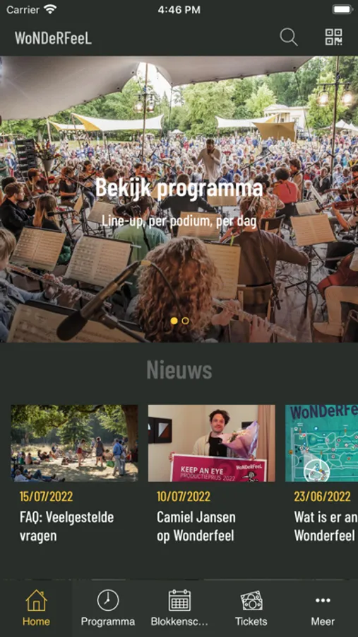 Wonderfeel is een driedaags buitenfestival voor klassieke muziek met de ongedwongen sfeer van een popfestival. Op het 25 hectare natuurgebied in ‘s-Graveland liggen de zeven Wonderfeelpodia een mini-wandeling van elkaar verspreid. Ze bieden voor elk wat wils: van Mozart tot Aart Strootman, van Rameau tot Pärt met lijntjes naar jazz, wereld- en popmuziek. Er zijn musici van wereldklasse: jonge honden en oude rotten. Verder op het programma: dans, poëzie, muziekdocs, natuurwandelingen, yoga en diverse kinderactiviteiten. Het publiek luistert ontspannen op bankjes, in zitzakken onder de bomen of op een kleed in het gras. Er zijn rollende keukens met pizza en bier, bouillabaisse en champagne en alles wat daar tussen zit. Op het groene festivalterrein biedt Wonderfeel een totaalbeleving van klassieke muziek voor een breed publiek van nu. Deze app toont bezoekers het volledige programma in een handig overzicht (blokkenschema en chronologisch). Het houdt de locatie van de gebruikers en de afstand tot de podia en evenementen bij. De app bericht gebruikers wanneer een evenement start en gebruikers kunnen hun eigen programma samenstellen.