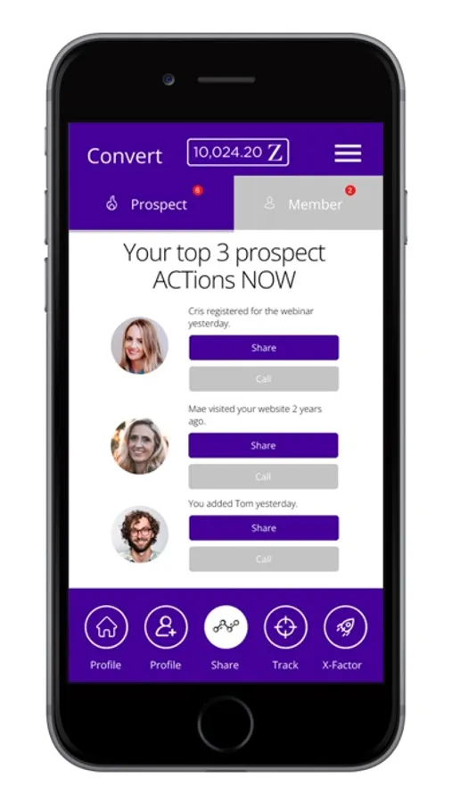 The app tracks all your invitations to contacts and their response back telling you your next follow up step and giving you a suggested text to keep a conversation with each person you're inviting to Zinzino.