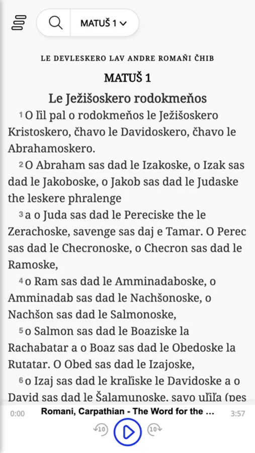 This Biblia Romanes-app is a simple Bible in your pocket. It contains the New Testament and some books of the Old Testament in Carpathian Romani, the Romani dialect spoken mainly in Slovakia and Czech, but also in parts of Poland, Ukraine and Romania. It also contains the audio recording of the New Testament allowing you to listen to a dramatized reading of God’s Word. The app has a simple interface and can be downloaded for offline access.