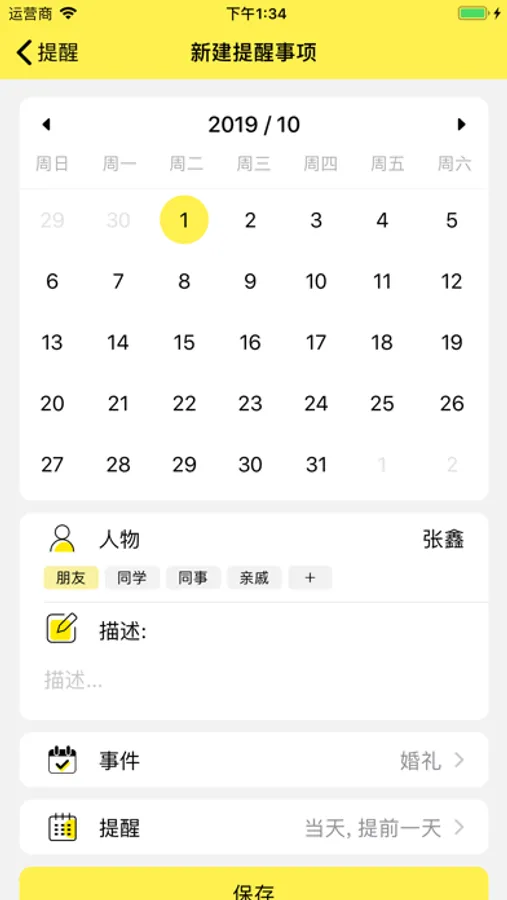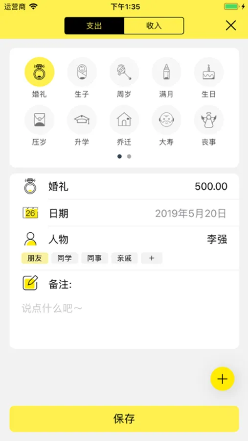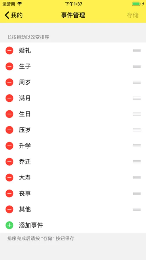 App 内置了“婚礼、生子、周岁、满月、生日、压岁、升学、乔迁、大寿、丧事”常见的随礼习俗事件,不用担心您可以非常方便的自定义事件。