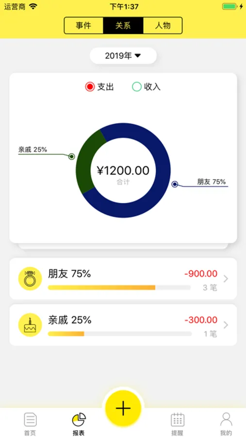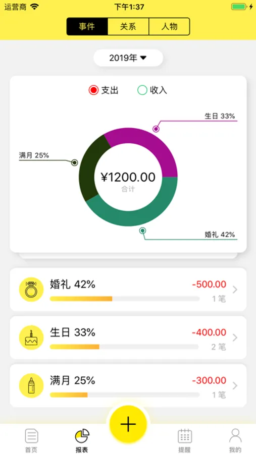 App 提供了按事件、关系、人物三个纬度提供分析统计报表,您可以一目了然查看每一笔收入和支出的大类,