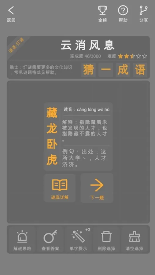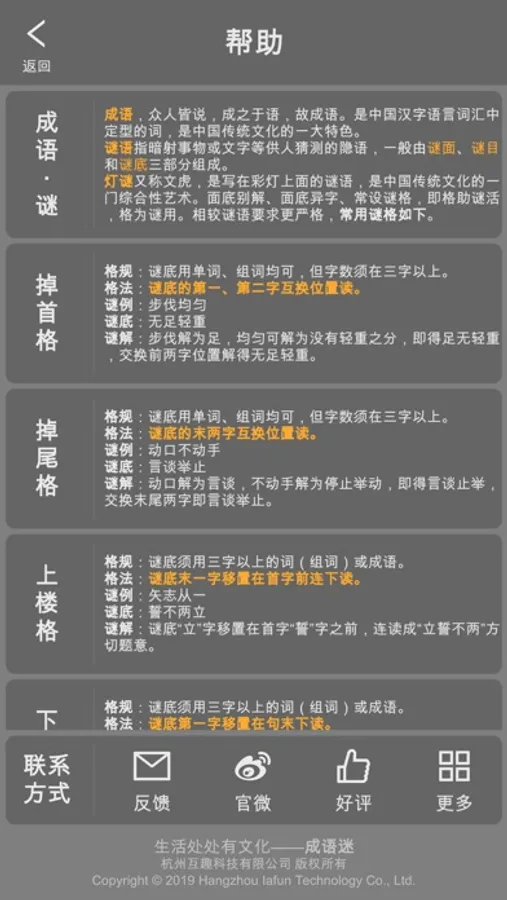 提供大量的谜语/灯谜/歇后语,需要不断的猜出完成闯关,考察已掌握成语的熟练程度,并能检测成语的敏感性,以及抽象思维的能力。
