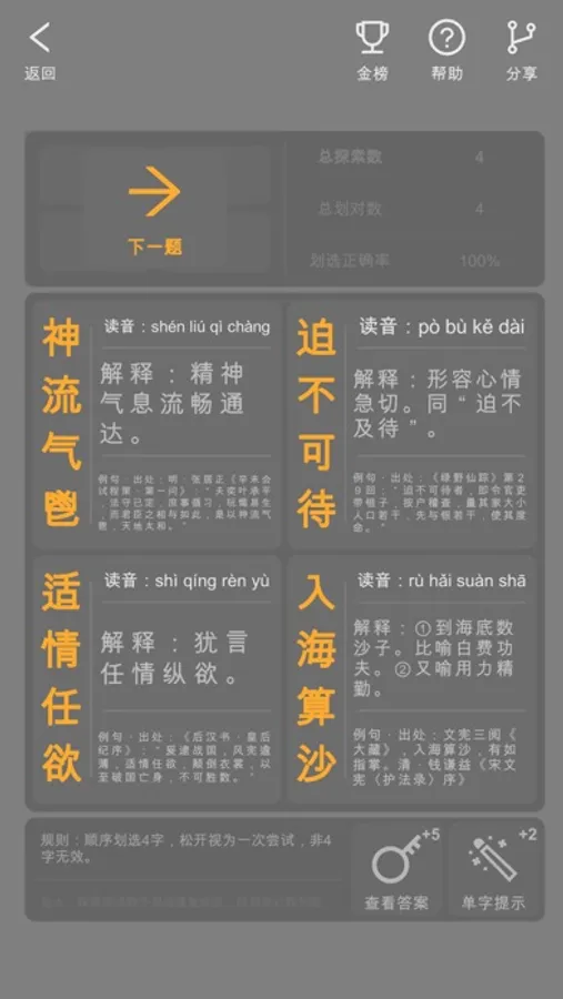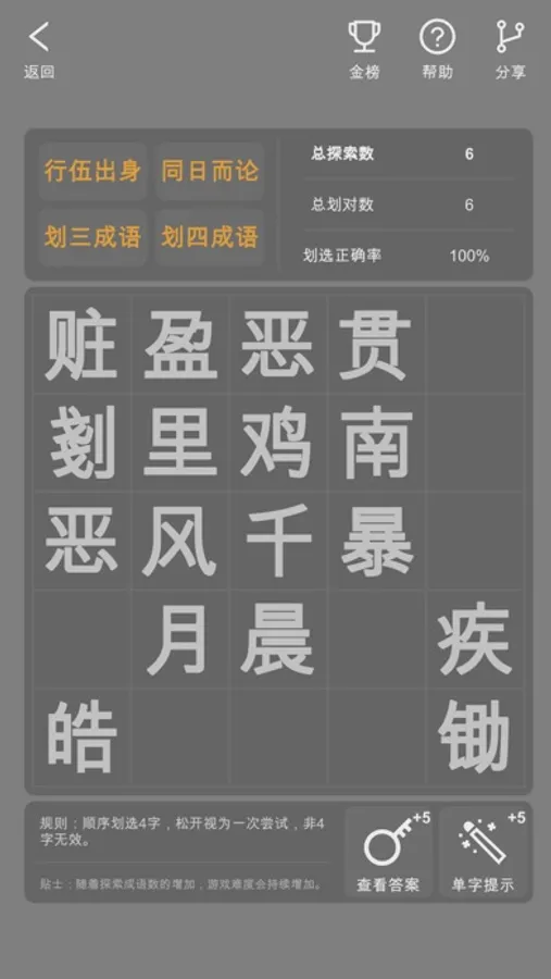 在一堆汉字方阵中,按照正确的顺序划出成语,随着闯关数的增加,难度也会增加,考察快速识别成语,锻炼短暂记忆的能力,同时对空间思维能力也有一定的提升。