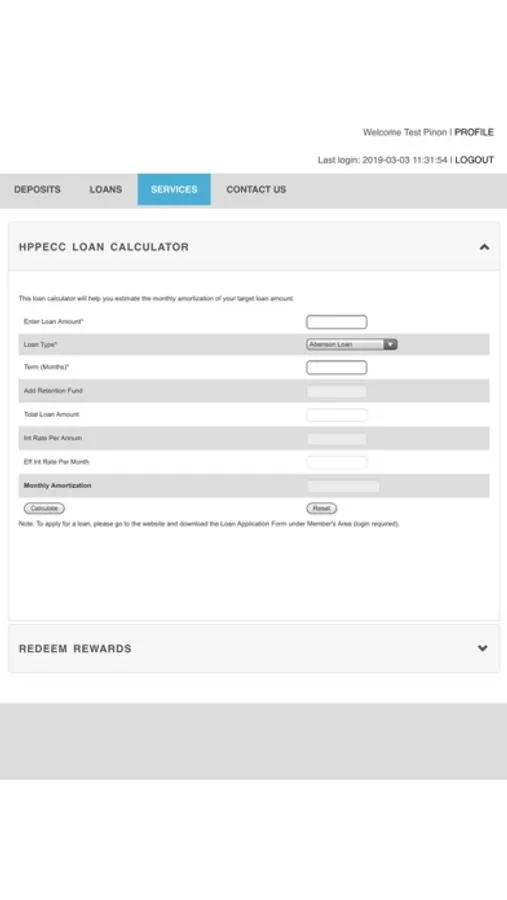 - Loan Calculator - allows members to calculate amortization based on target loan amount.